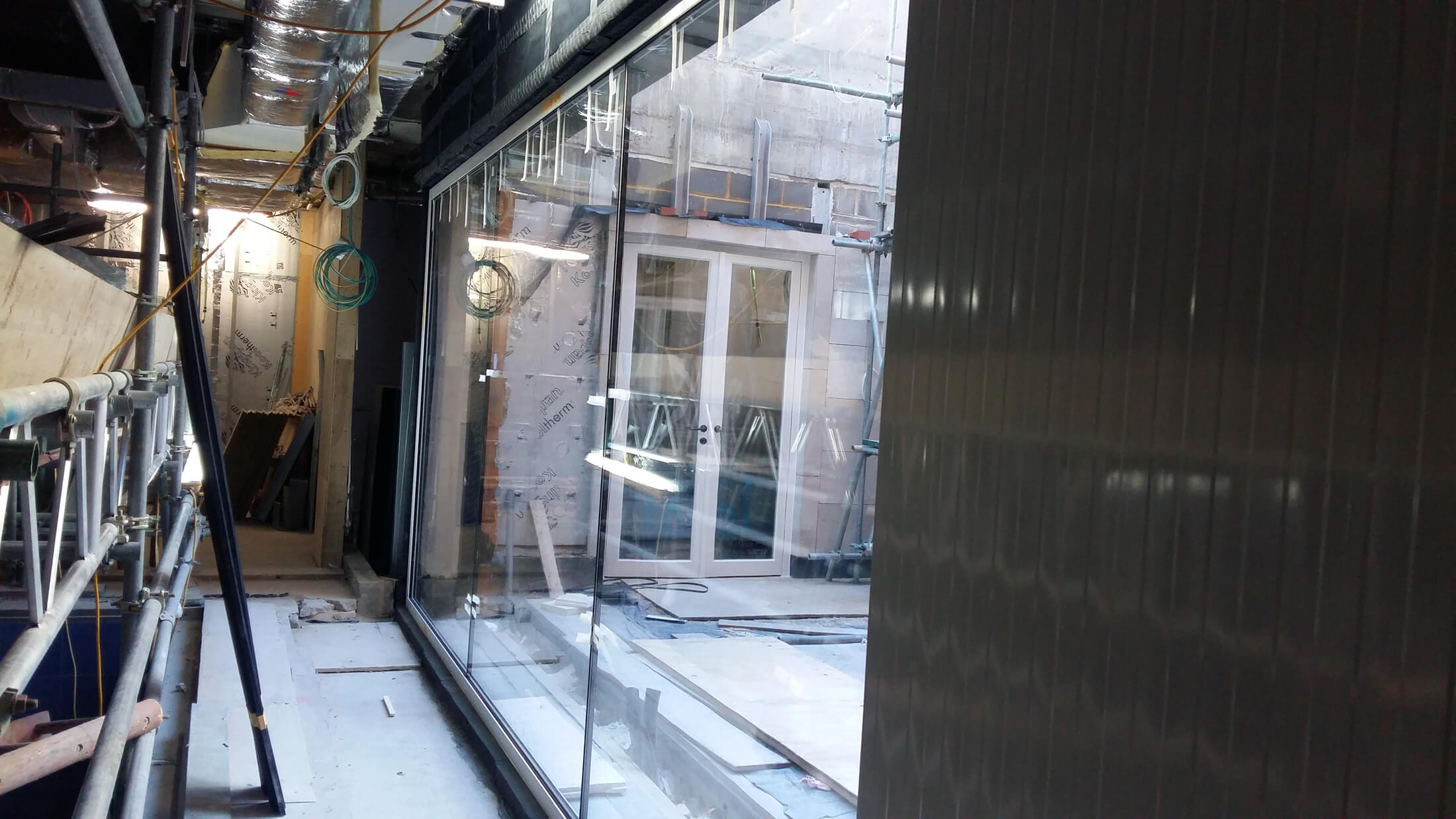 Sistema a scorrimento tutto vetro di 9m motorizzato, con sistema di illuminazione dei cortesia LED.